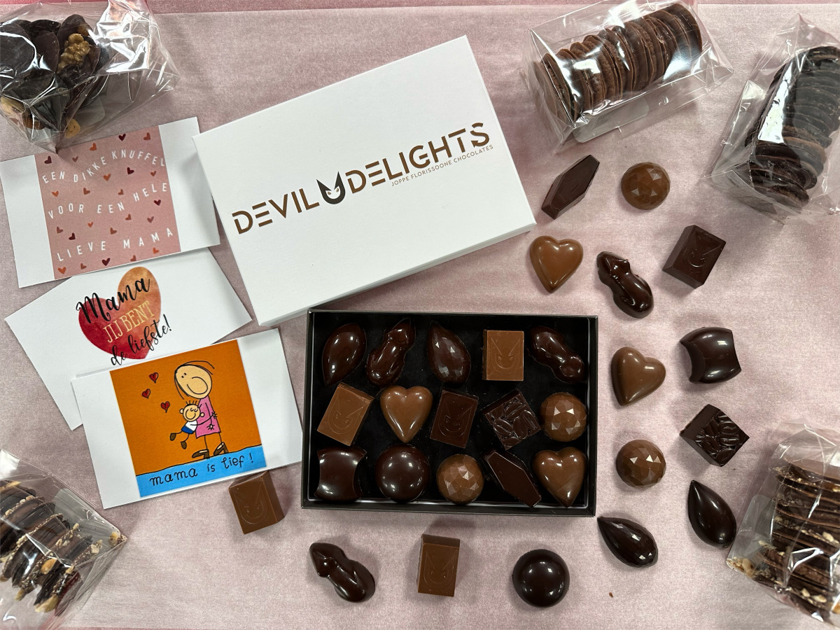 Een exclusievebox voor moederdag bevat 15 pralines ipv 8, uit het assortiment van DevilDelights.